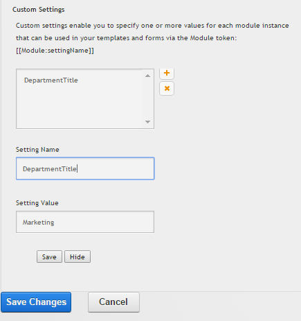 To add a setting, click the + button. To delete a setting, select it in the list box and click the X button. To edit a setting, select it in the list box. For each setting you'll provide a Name and a Value. To use the setting, you'll create a Module token with that Name like so: [[Module:settingName]] where settingName is the value you enter into the Setting Name box. To save the Custom Setting, click on Save. Then, select Save Changes to commit the changes to the Settings tab. At run time, the Module token will be replaced by the setting Value you specify. So, in the example shown in the screen shot, if we placed [[Module:DepartmentTitle]] in our template, it would be replaced by Marketing at run-time.