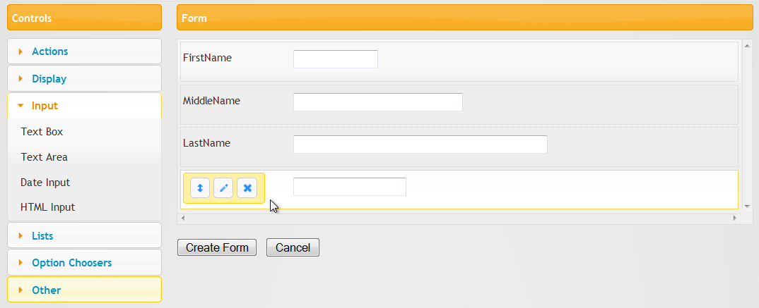 Once a control is on the form, hovering over it will display a toolbar. Using the toolbar, you can Edit the controls properties, Delete the control, and Move the control simply by clicking and dragging.