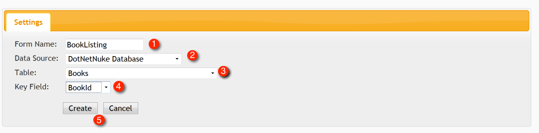 If you want XMod Pro to auto-create a basic Add and Edit form for you, select a Data Source. You can choose a table in the DNN database or one in an External SQL Server database. If you choose the latter, you will need to supply a connection string. If you just want a bare-bones form skeleton, choose "None".