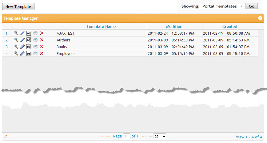 Click the magnifying glass icon on the row of the template you want to Preview. NOTE: This is a Live Preview, with actual data from your site. Not all the styles of your skin are applied to the template for the preview. Therefore it may look different when viewed at run-time. Additionally, any Edit/Delete buttons will not appear in the preview. You can, however, click Detail buttons/links to see the detail template.