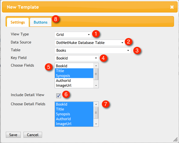 Finally, click the "Save" button and your template will be generated and placed into the template editor, ready for editing. The generated template definition provides the list and detail templates and their data commands along with some basic styling. If selected, it also provides a button to view the record's details, a button to Edit the record, and a button to create a new record. The Edit button is set to pass the record's unique identifier to a form. It is up to your form to use that ID when editing the record. Once you are satisfied with your edits, type a name for your new template into the "Template Name" text box and click the Save button.