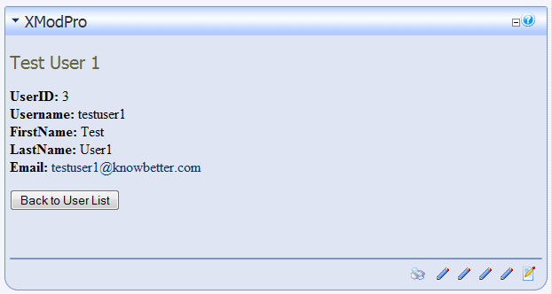 <xmod:template> <ListDataSource CommandText="SELECT UserID, DisplayName FROM Users ORDER BY DisplayName ASC" /> <DetailDataSource CommandText="SELECT UserID, Username, FirstName, LastName, DisplayName, Email FROM Users WHERE UserID = @uid" /> <HeaderTemplate> <ul> </HeaderTemplate> <ItemTemplate> <li class="Normal"> <xmod:detaillink text='[[DisplayName]]'> <parameter name="uid" value='[[UserID]]' /> </xmod:detaillink>` ([[UserID]]) </li> </ItemTemplate> <AlternatingItemTemplate> <li class="Normal"><strong> <xmod:detaillink text='[[DisplayName]]'> <parameter name="uid" value='[[UserID]]' /> </xmod:detaillink>` ([[UserID]])</strong> </li> </AlternatingItemTemplate> <FooterTemplate> </ul> </FooterTemplate> <DetailTemplate> <h1>Details for: [[DisplayName]]</h1> <p> <strong>UserID:</strong> [[UserID]]<br /> <strong>Username:</strong> [[Username]]<br /> <strong>FirstName:</strong> [[FirstName]]<br /> <strong>LastName:</strong> [[LastName]]<br /> <strong>Email:</strong> <a href="mailto:[[Email]]">[[Email]]</a> </p> <xmod:returnbutton text="Back to Users List" /> </DetailTemplate> </xmod:template>1